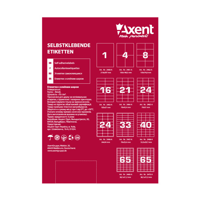 Етикети Axent 105x148.5 mm, 100 л. 4 етик. Марка:Axent размер:105x148.5 цвят:Бял брой листа:100 Тегло (kg):1.035 брой етикети на лист:4 вид:Хартия |
