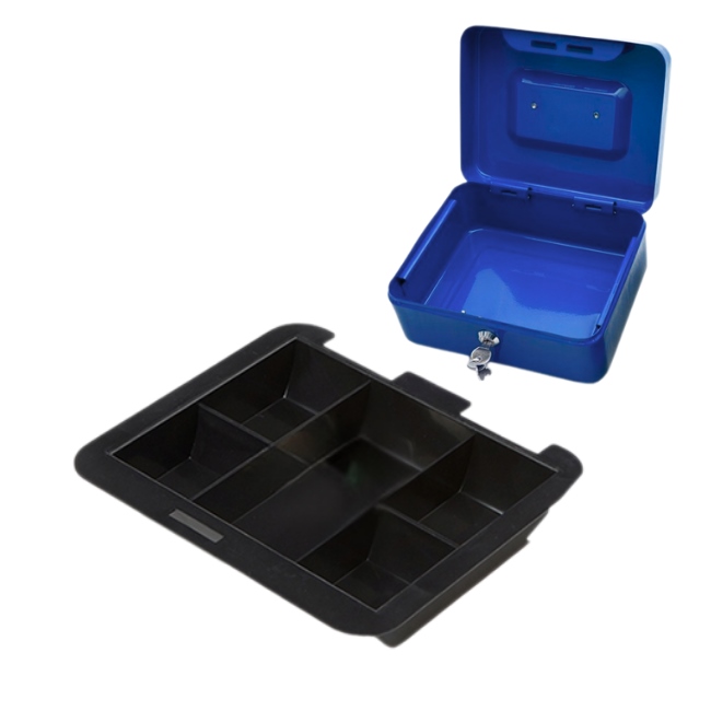 Метална каса с удобна дръжка за носене Изработена от стомана Подвижна табла за монети Заключване със секретен ключ (предлага се с 2 ключа) |