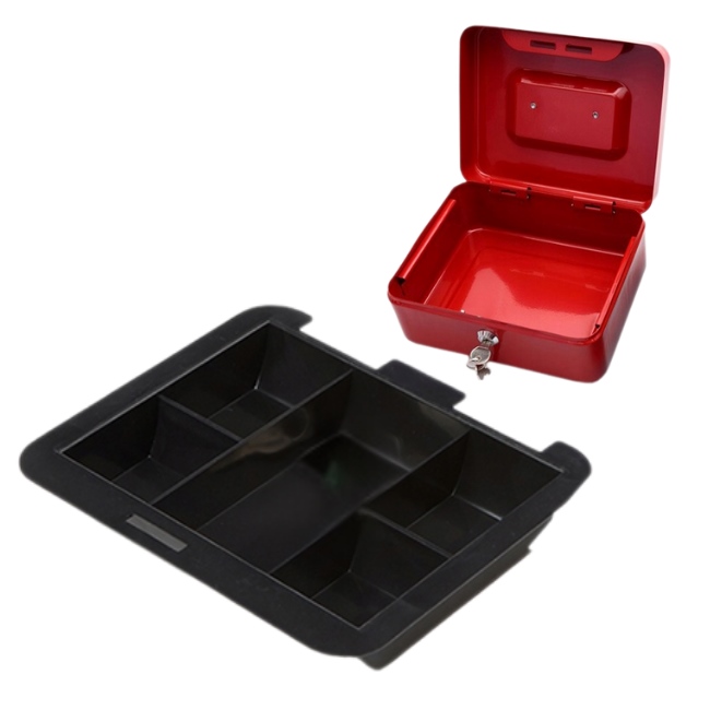 Метална каса с удобна дръжка за носене Изработена от стомана Подвижна табла за монети Заключване със секретен ключ (предлага се с 2 ключа) |